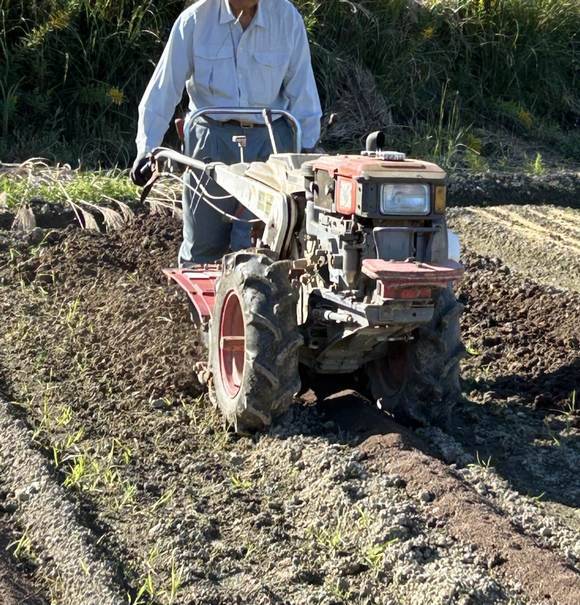 乾燥牛糞をまいた上に乾燥鶏糞を撒いて耕運機で耕します。