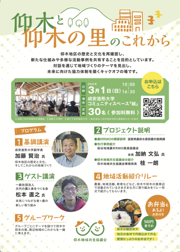 2026年3月1日、地域の歴史や文化を再確認し、新たな仕組みや多様な活動事例を共有することで、これからの地域づくりを共に考える場作りの一環として、「仰木と仰木の里のこれから」と題したイベントを開催しました。